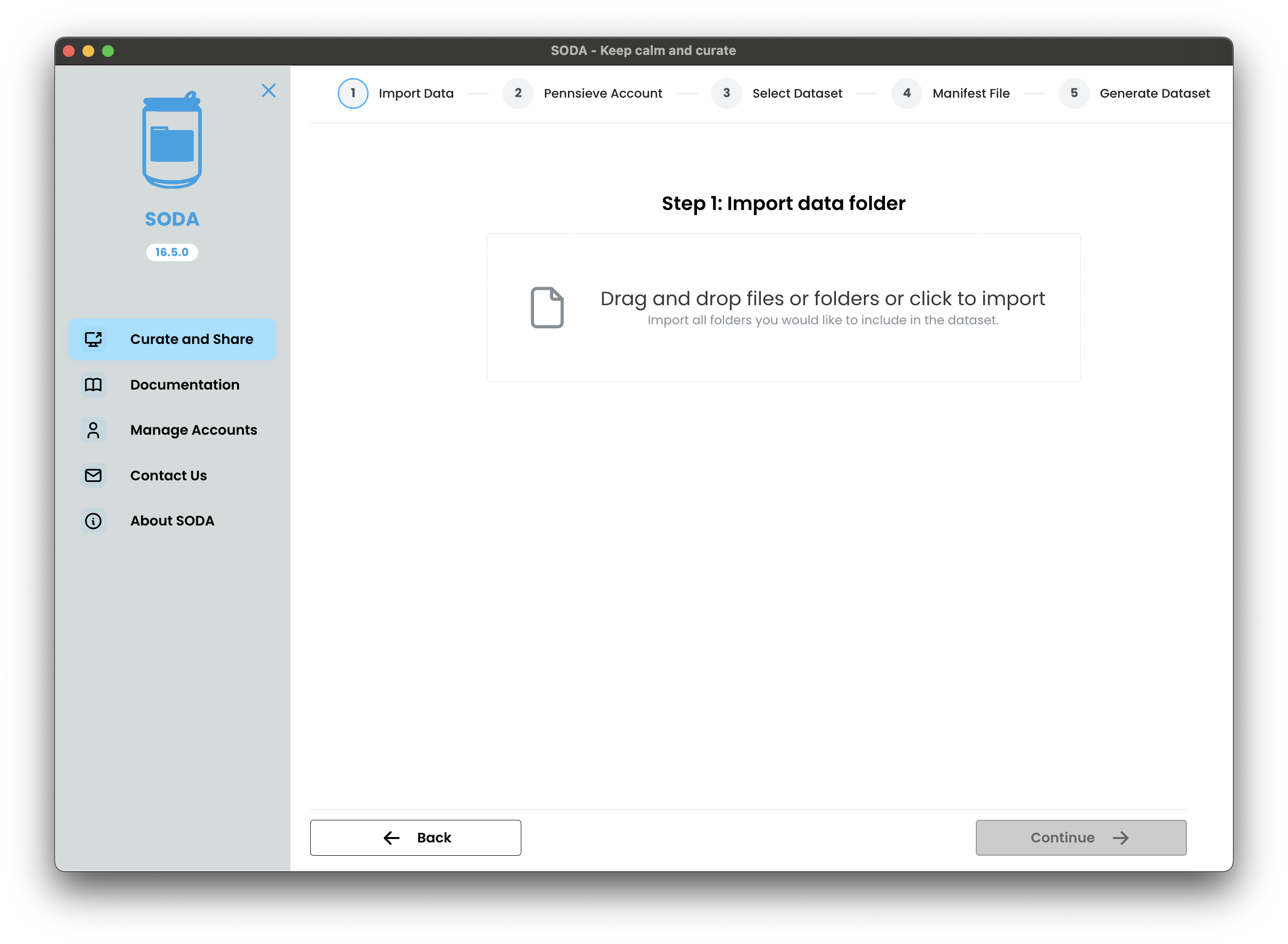 Select an already organized dataset to upload to Pennsieve. You can start by drag and droping the folder into the green container or by clicking the Browse Computer button to select the folder.