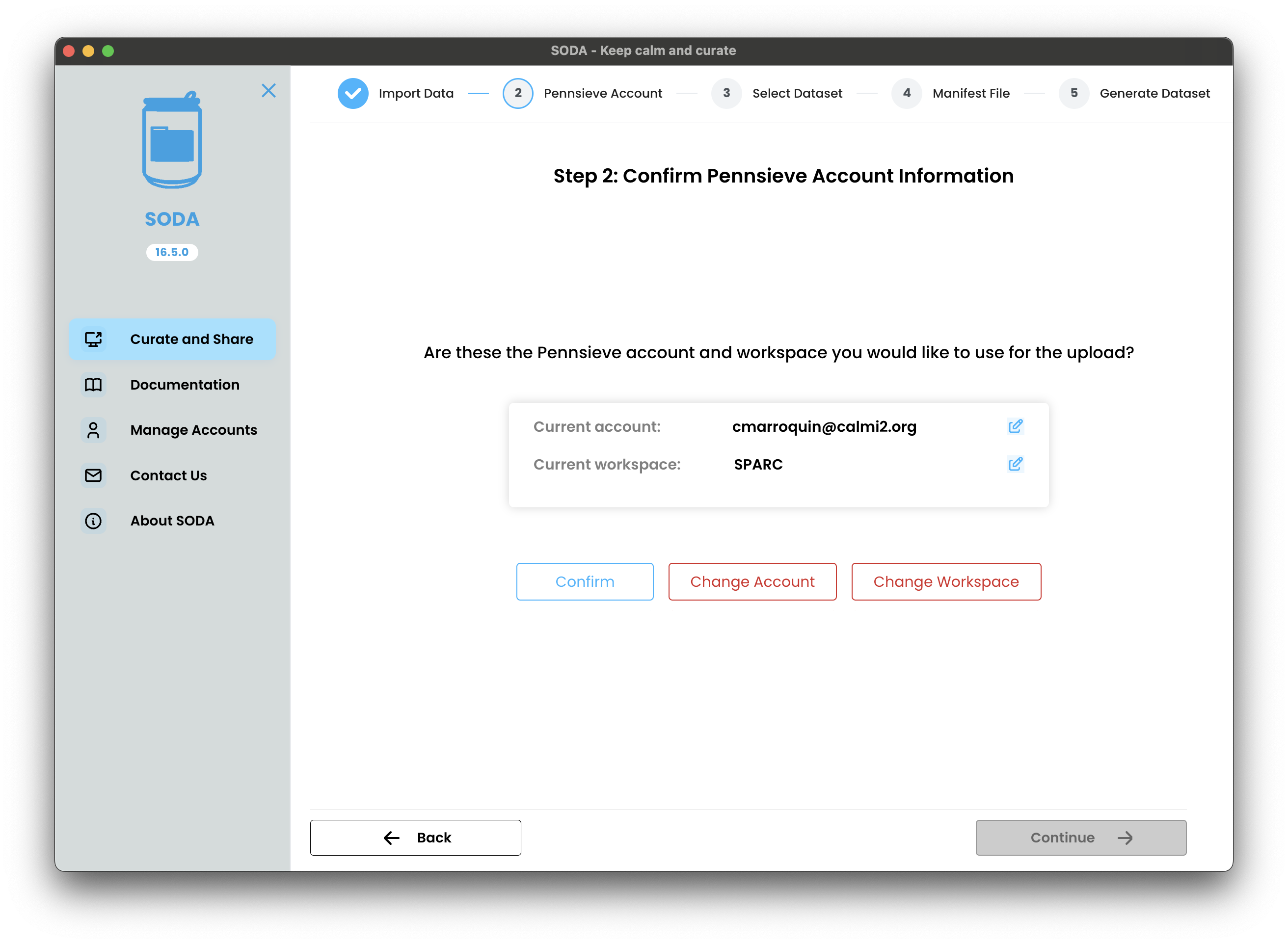 Confirm the account and workspace you want to use for your dataset. If you have multiple Pennsieve accounts, you can select the account you want to use for the dataset. You can also select the workspace where you want to generate the dataset.