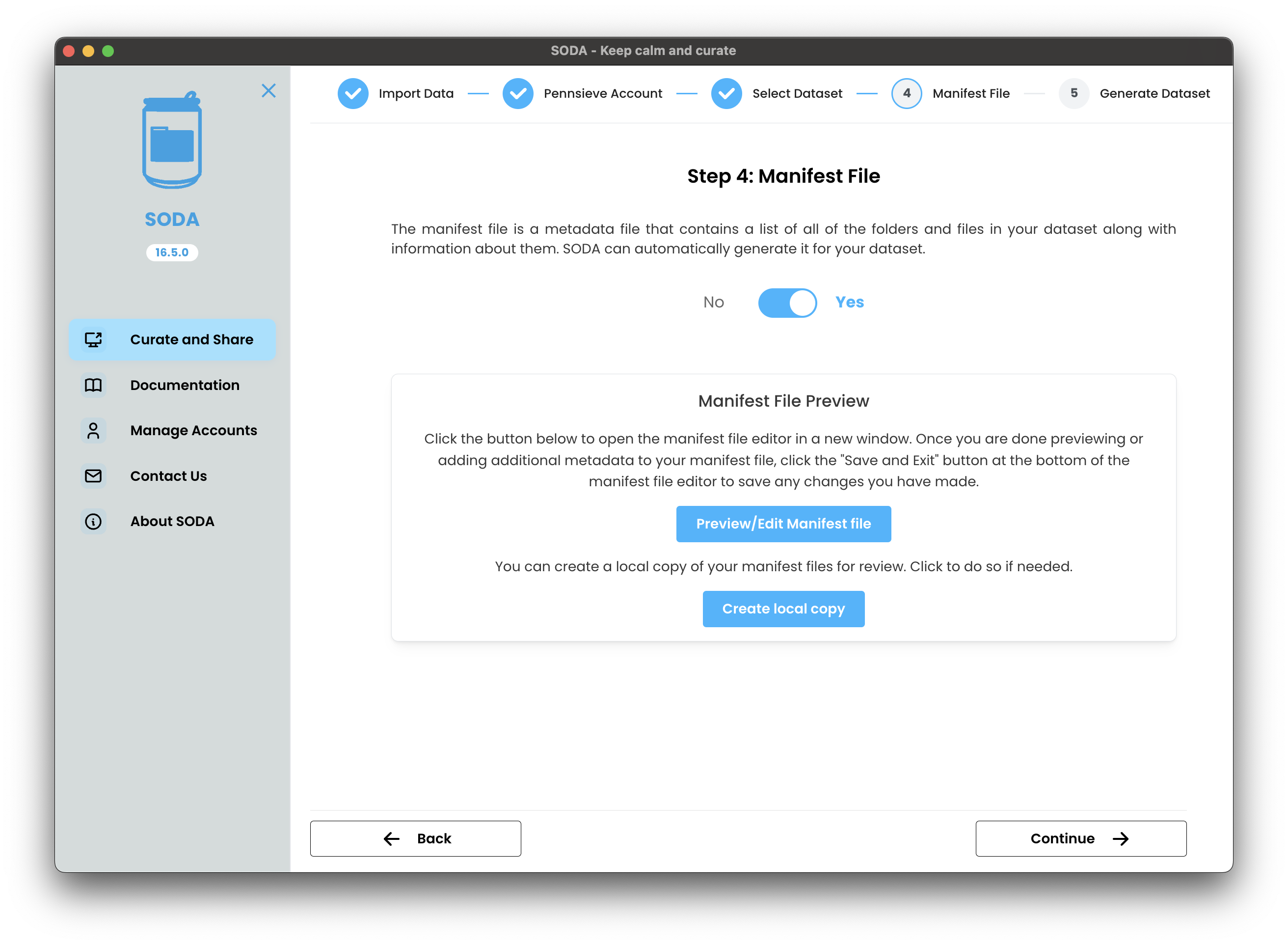 For uploads going to a new Pennsieve dataset, simply toggle the option to Yes. Then a manifest.xlsx file will be added at the root of your dataset with the filename, timestamp, and file type fields automatically populated in the correct format. The additional fields in the manifest file can be edited by clicking the 'Preview/Edit Manifest file' button, making the desired changes in the manifest file editor, and then clicking 'Save and Exit'.